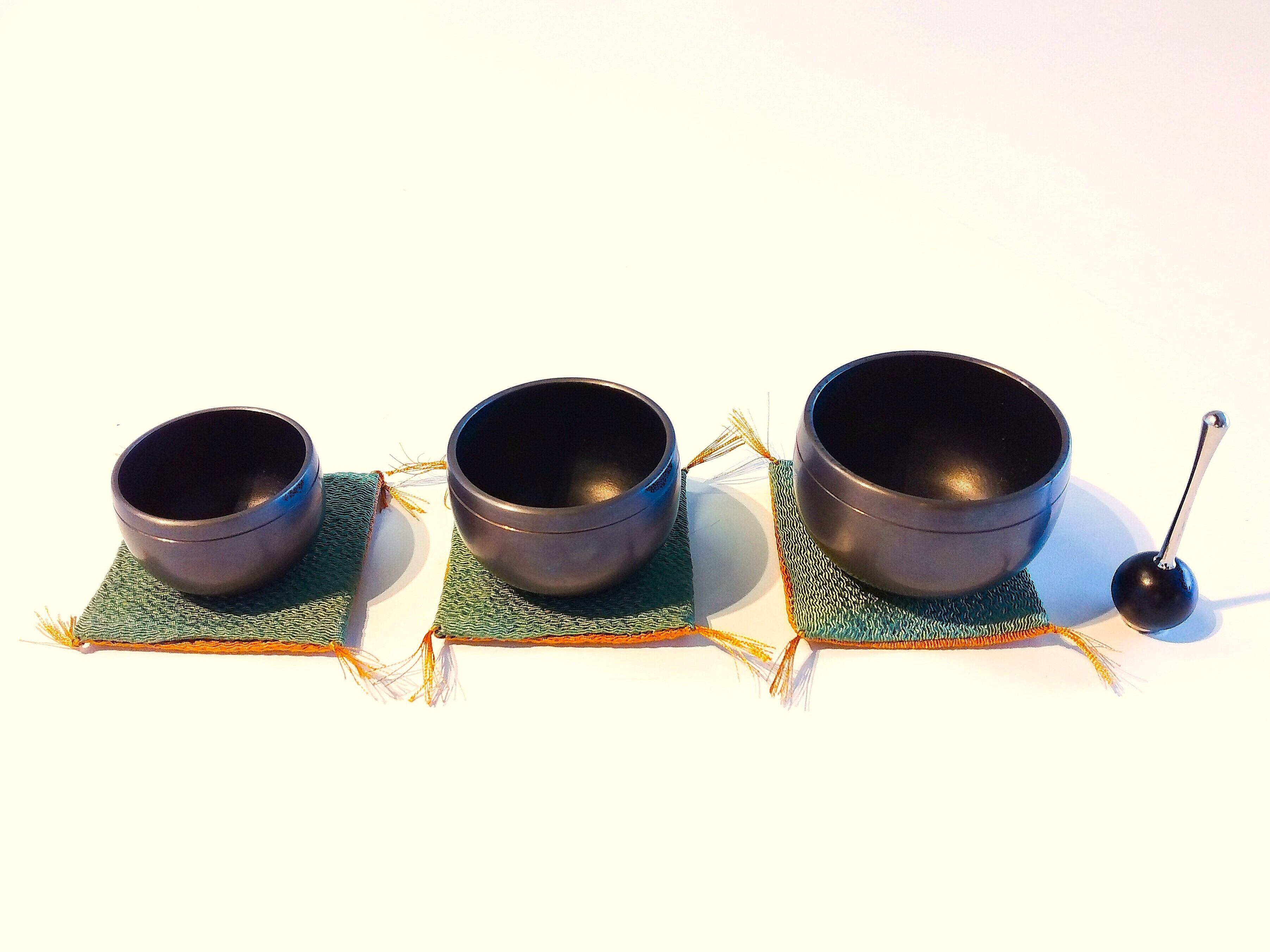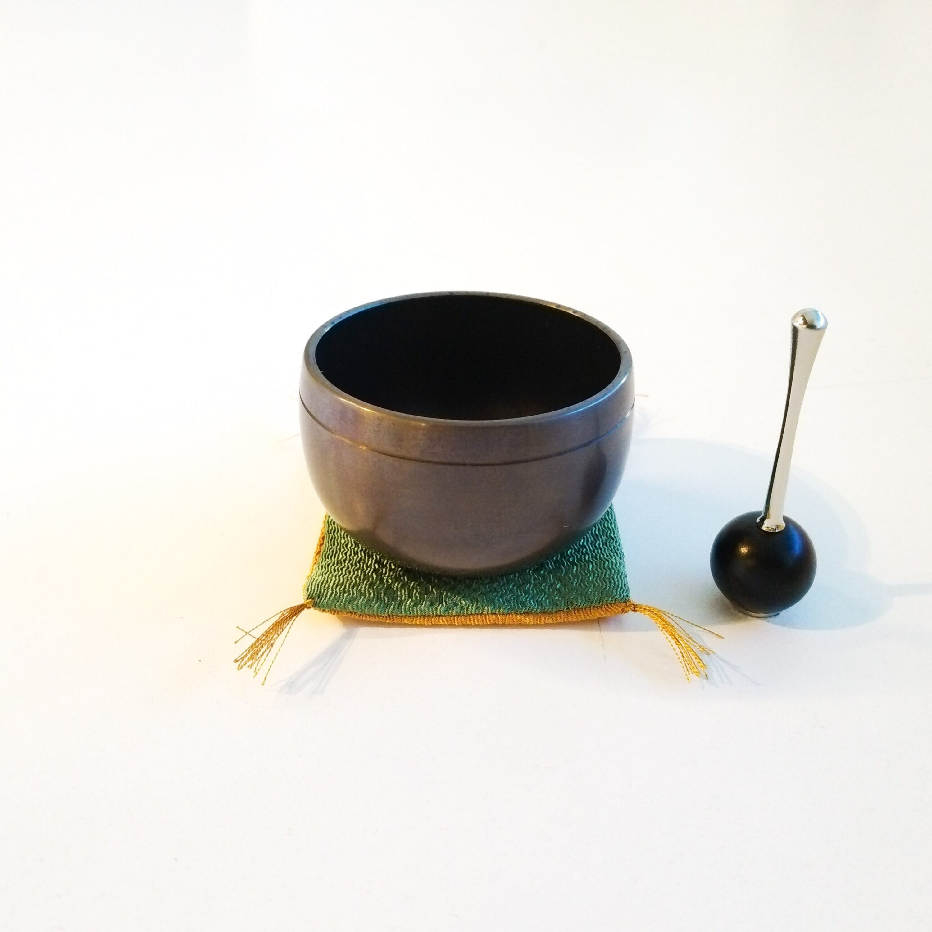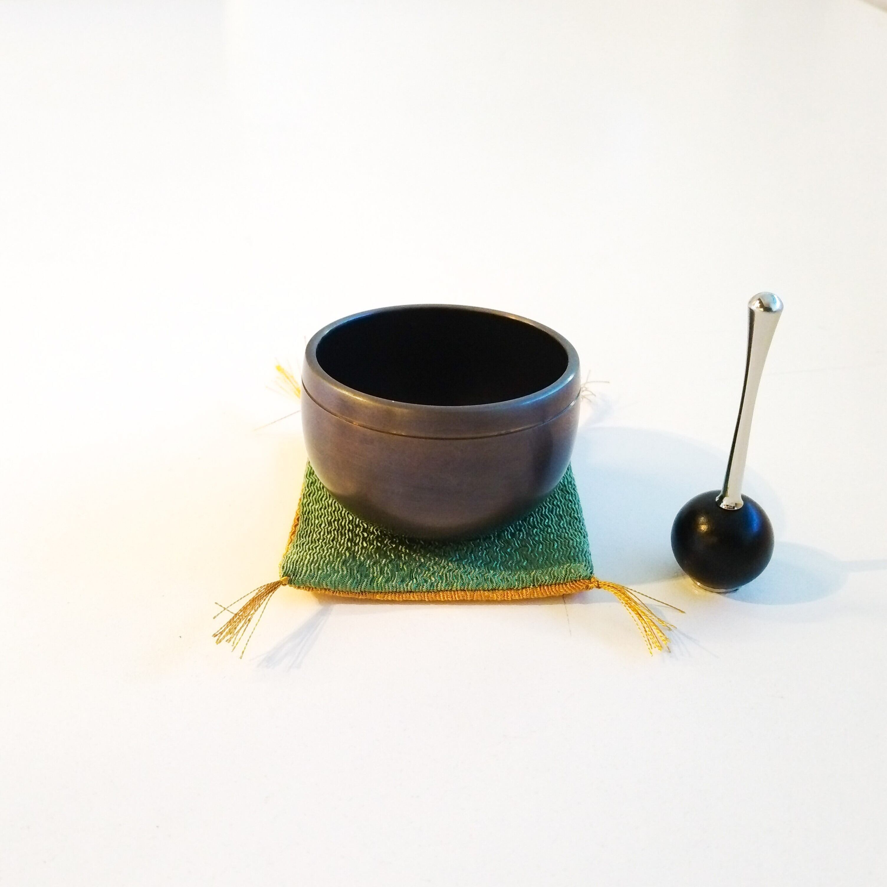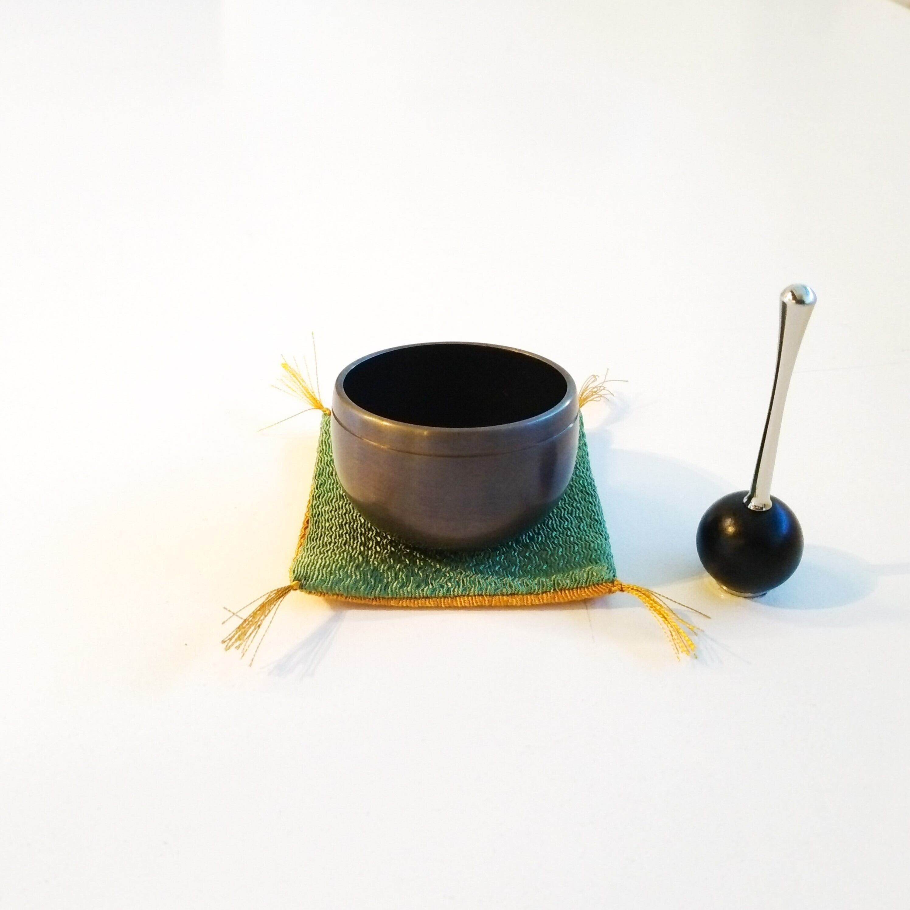 おりん、りん棒、ふくさの3点セット。ふくさは緑色とからし色のリバーシブルです。